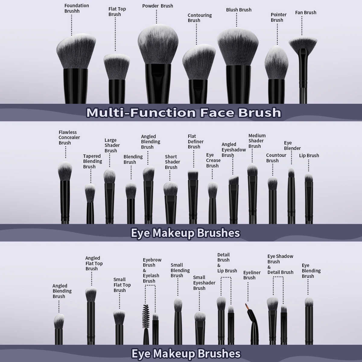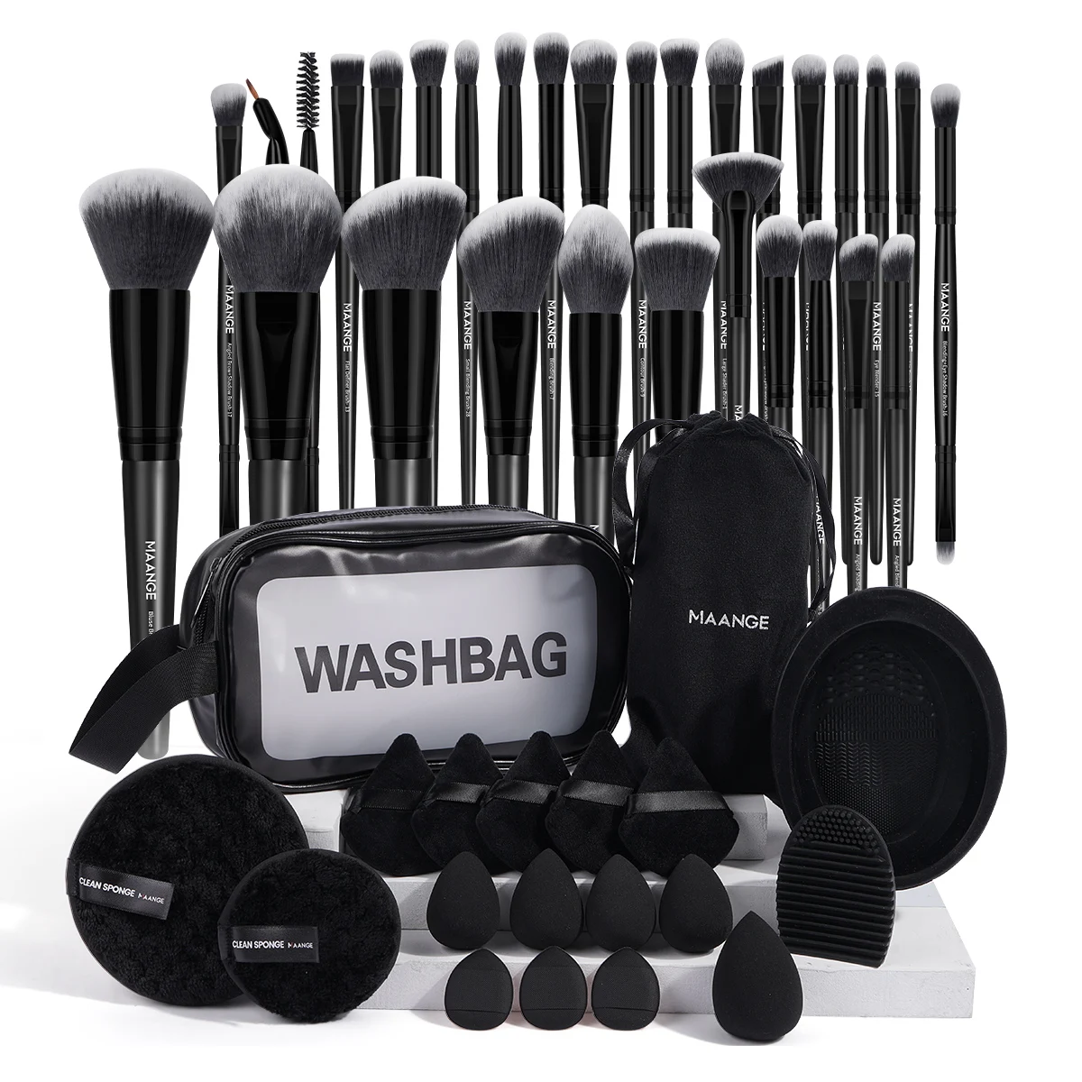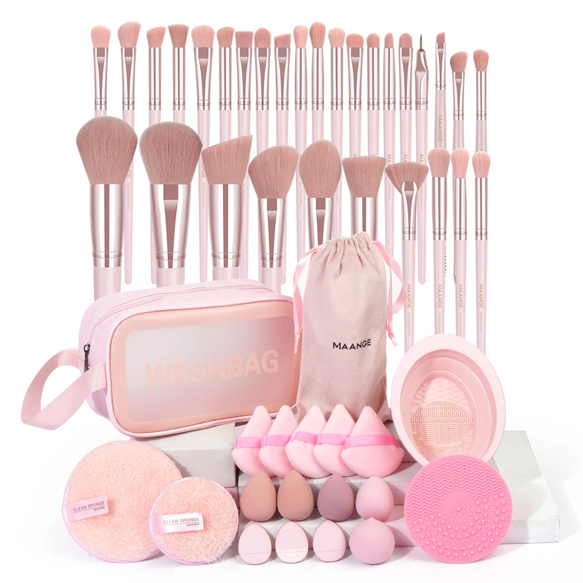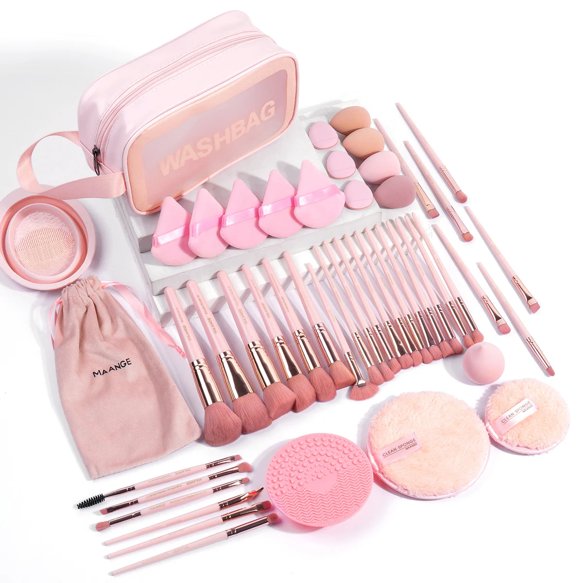 Package Include: 30PCS Makeup Brush with Bag, 13PCS Powder Puff, 2PCS Cleaning Makeup Remover Pad ,2PCS Brush Cleaning Mat,1 Wash Bag